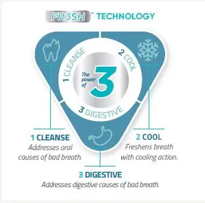 פעילות במערכת העיכול ריח רע יכול להיגרם מבעיות במערכת העיכול עקב אוכלוסיית חיידקי מעיים לא מאוזנת. טכנולוגיית FR3SH כוללת תוספת פרה-ביוטיקה לקידום אוכלוסיית חיידקי מעיים מאוזנת ובריאה.